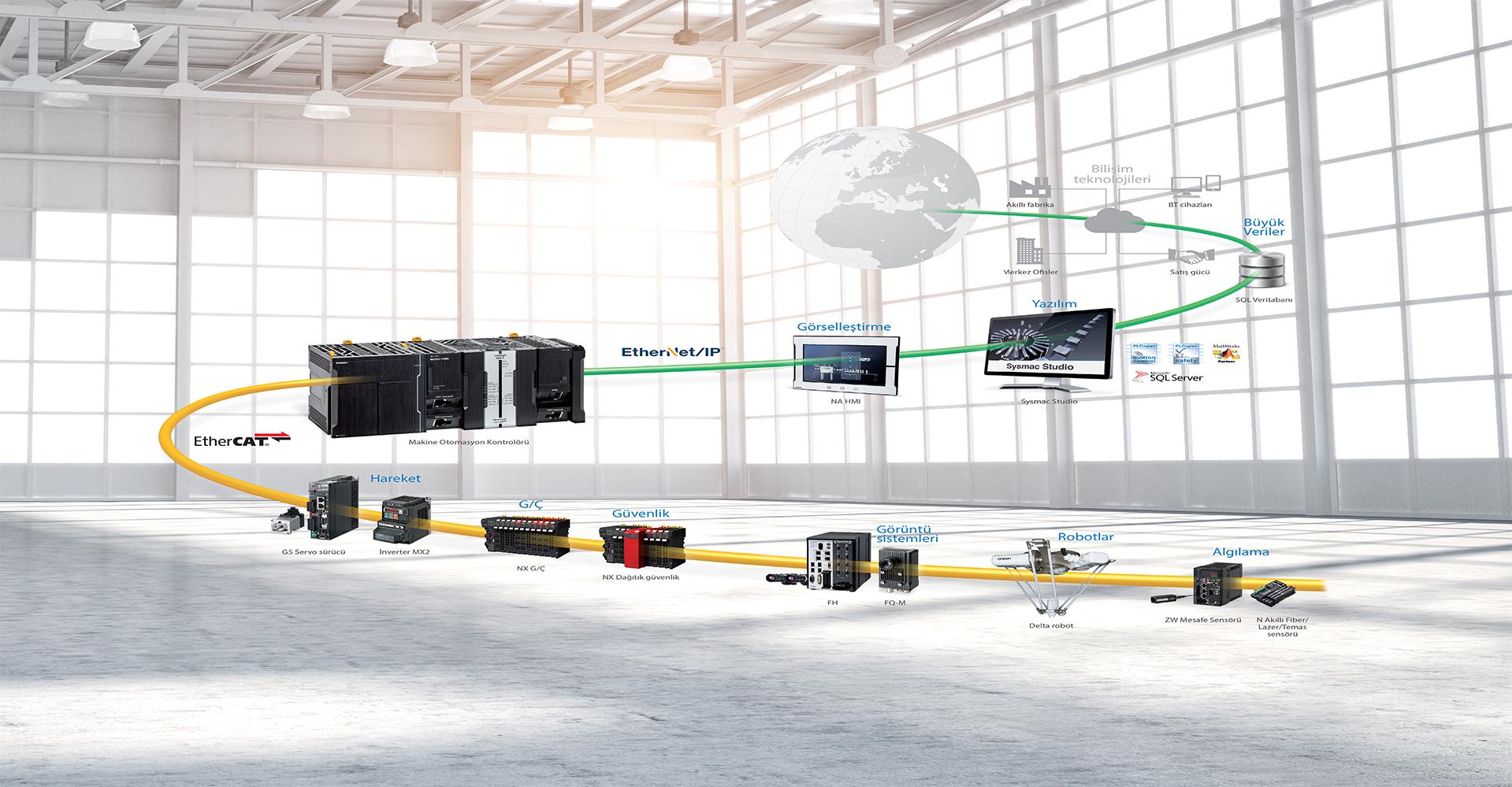 Endüstriyel otomasyon; uygulamalarınızı tek bir kaynaktan çözümleyebilmek için geniş ve türetilmiş ürünlerimizden size en uygun çözümleri sunarız. Ürün portföyümüz; PLC ürünleri, servo motorları, servo sürücüleri, operatör panellerin, motor sürücüleri, Molex kablolu konnektörleri, Soft Starterleri, Trio Motion Kontrolcüleri, güç kaynaklarını .Fabrika Otomasyonu, Sensörler ve Güvenlik, Mekatronik ve Sürücüler, Endüstriyel Komponentler ve Görsel Denetim Sistemleri. otomasyon sektörünün kullanımına sunmaktadır Robot , mekanik sistemleri ve bunlarla ilişkili kontrol ve algılama sistemleri ile bilgisayar algoritmalarına bağlı olarak yeniden programlanabilen; maddeleri , parçaları, aletleri, programlanmış hareketlerle yapılacak işe göre taşıyan veya işleyen çok fonksiyonlu makinelerdir.Endüstriyel robotiğin temel işlevi, tanımlanmış rutin görevlerin aynı şekilde ve sürekli tekrar edilen üretimleri; daha seri ve hızlı ve güvenilir şekilde yapan sistemlerdir.